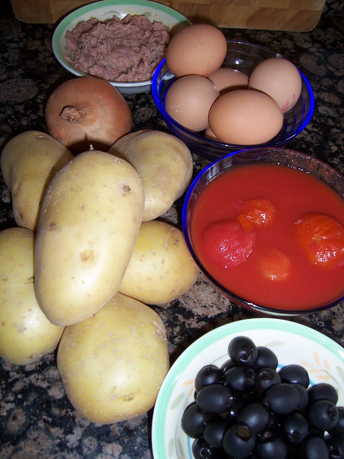 Una vez frías las patatas y los huevos los pelamos y troceamos en una ensaladera y añadimos el resto de los ingredientes, el atún, los tomates y el caldito también, las aceitunas y la cebolla cortada