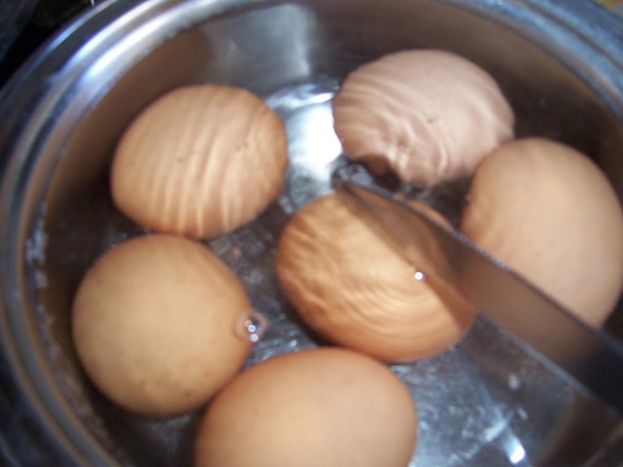 Ponemos también los huevos a cocer con un puñado de sal y un chorrito de vinagre, cuando el agua rompa a hervir los dejamos 10 minutos, cambiamos el agua fría por agua caliente y los rompemos un poco con un cuchillo y los dejamos enfriar, de esta manera luego será más fácil pelar.
