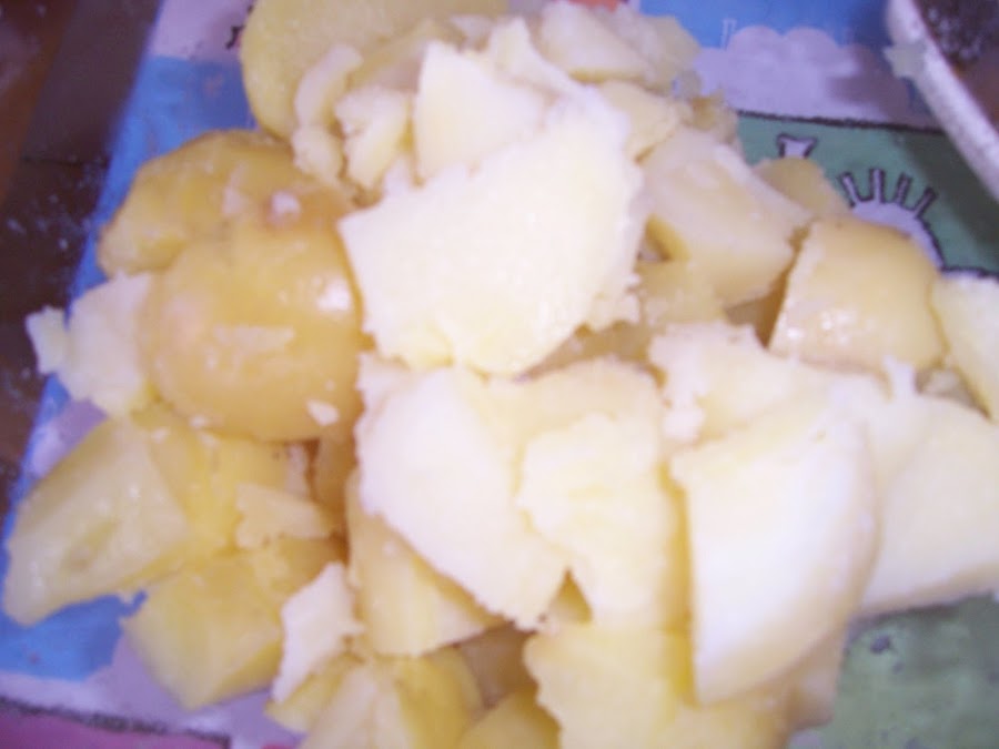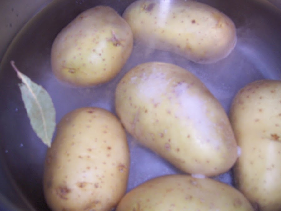 En primer lugar ponemos a cocer las patatas con un puñado de sal y la hoja de laurel, cuando el agua rompa a hervir las dejamos unos 20 minutos, están listas cuando al pinchar con un palillo o cuchillo sale fácil, escurrimos y dejamos enfriar.