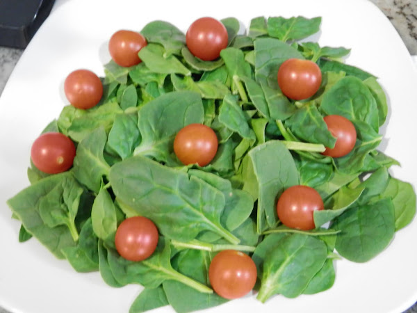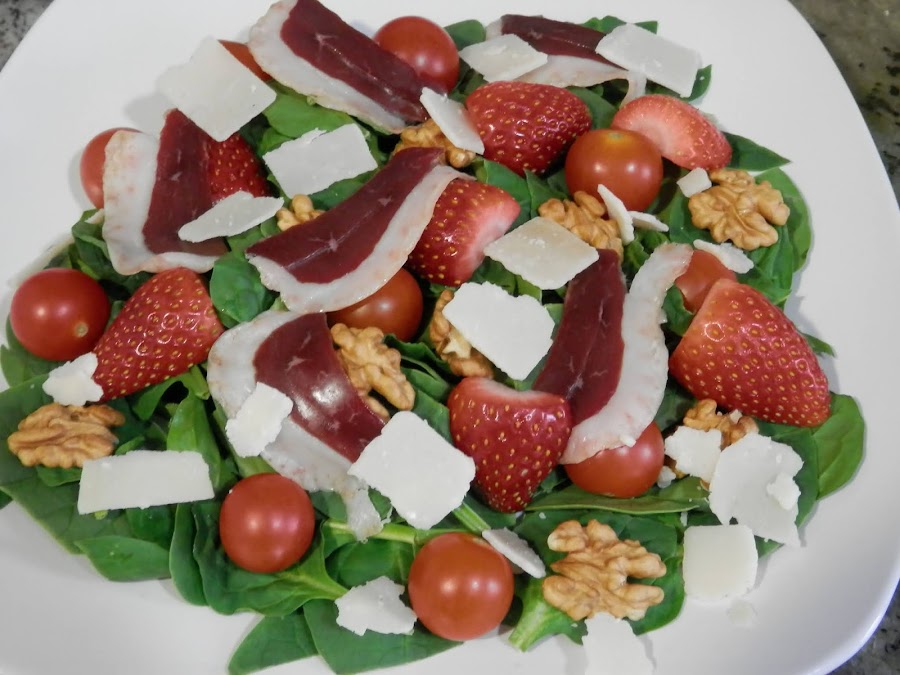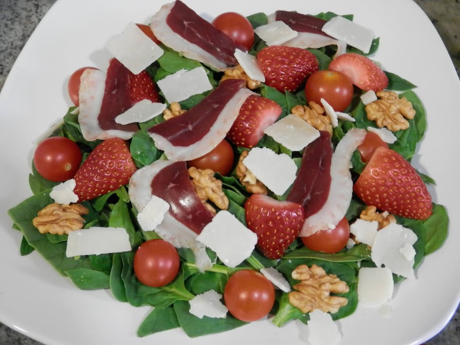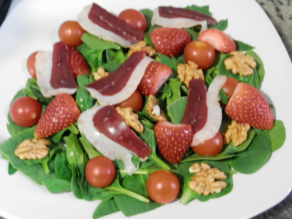 Limpia y trocea las fresas y ponlas por encima de la ensalada.