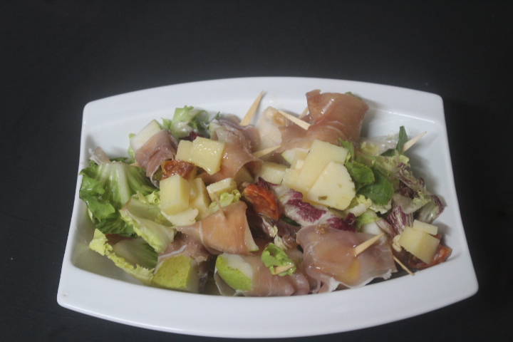 Añadimos la pera con el jamón a la ensalada.