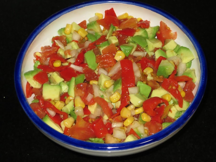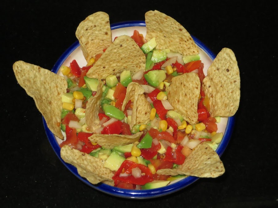 Pelamos y cortamos el tomate en trocitos y lo echamos en un bol, le añadimos el maíz y el pimiento. Pelamos y cortamos el aguacate y lo añadimos a la anterior mezcla. Rociamos con el zumo de limón. Aliñamos y le añadimos los totopos y ya está lista para comer.