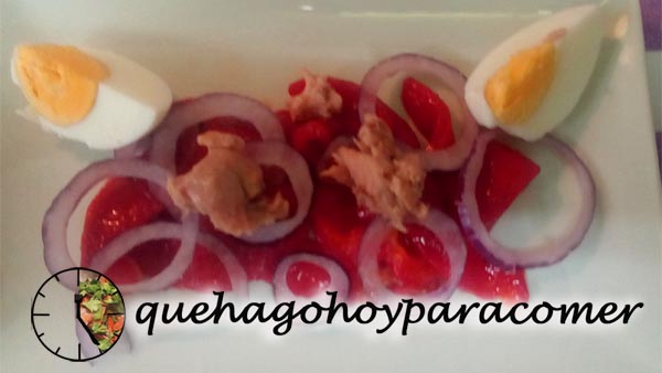 Montamos la ensalada al gusto: unos pimientos de base, unos aros de cebolla por encima y completamos con el atún y el huevo. Si se quiere, se puede aliñar con aceite de oliv, sal y vinagre, pero recordando que los pimientos están previamente aliñados.