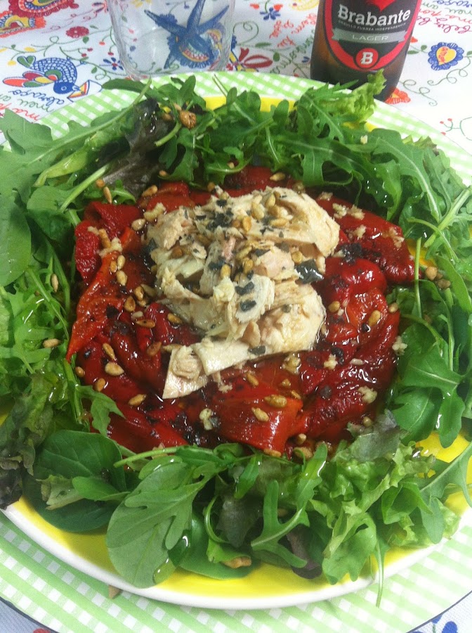 Esta ensalada está de vicio. Los pimientos son unas hortalizas muy nutritivas y que asadas cambian su textura y subliman su sabor. Combinadas con el frescor de los brotes verdes y el punto de vinagrillo que aporta el bonito en escabeche hacen una ensalada de 10.