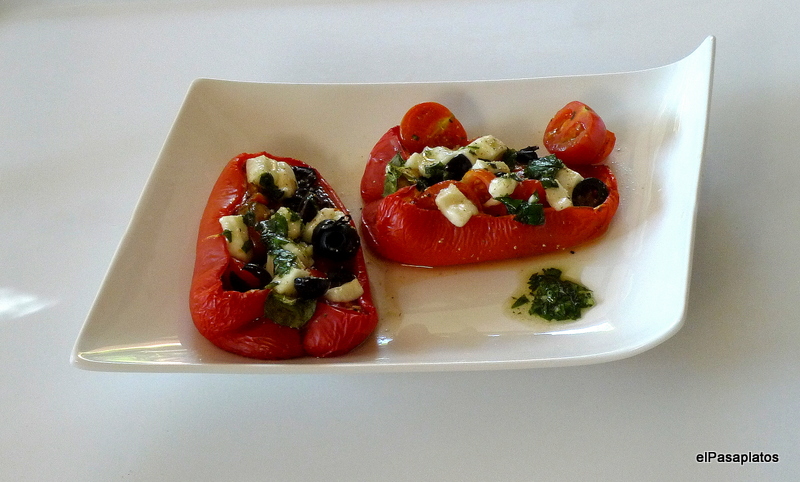 Sacar del horno y acabar de rellenar los pimientos con el queso, las aceitunas y los tomates. Finalizar con la salsa de albahaca.