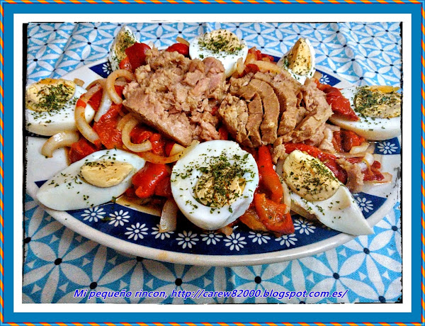 Una vez fríos y pelados los cortamos en tiras y los colocamos en una ensaladera , añadimos la cebolla cortada en juliana y mezclamos echando un buen chorrito de aceite de oliva virgen extra y un pellizco de sal , ponemos los huevos , esto es opcional la forma en la que queramos ponerlos en trozos grandes o en laminas .