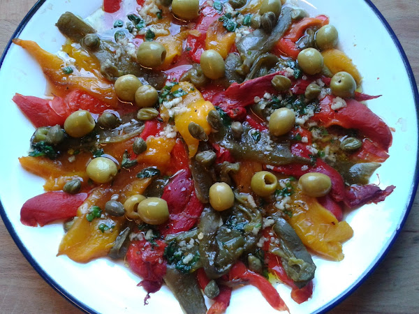 Pela los pimientos, pártelos a la mitad, quítales la parte superior, despepítalos y córtalos en tiras. Ponlos sobre una fuente para servir.
