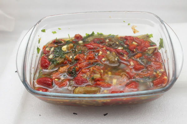 En esta ocasión, como es habitual los cocino ella, añadiéndoles dos berenjenas, yo solo aliñe los pimientos, cuando ya estaban limpitos.