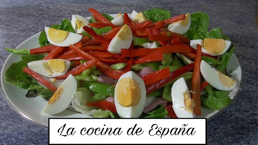 Lo primero que tenemos que hacer es cocer los huevos. Cuando se han cocido, se deja de enfriar, mientras tanto cogemos una fuente para la ensalada y escogemos las mejores hojas de lechuga y se va poniendo una capa de hojas de lechuga tapando toda la fuente, después se pone la cebolla que se ha cortado en aros cuándo se acaba de poner la cebolla en aros, ponemos las aceitunas que las hemos cortado en láminas, a continuación echamos las alcaparras, luego echamos el jamón york cortado en láminas, el pimiento verde cortado en láminas también igual que el rojo y se echan las dos y el huevo que ya se a enfriado y lo hemos quitado la cascara se corta en triángulos, el aceite de oliva extra virgen, el vinagre de módena y por último la sal una ensalada especial para el calor.