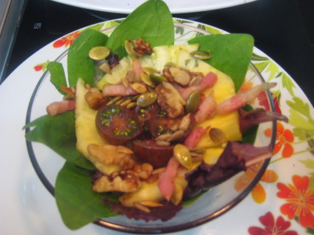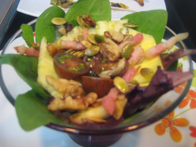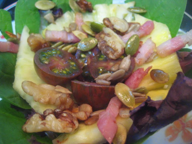 ENSALADA DE PIÑA, BACON, TOMATES NEGROS, NUECES Y SEMILLAS