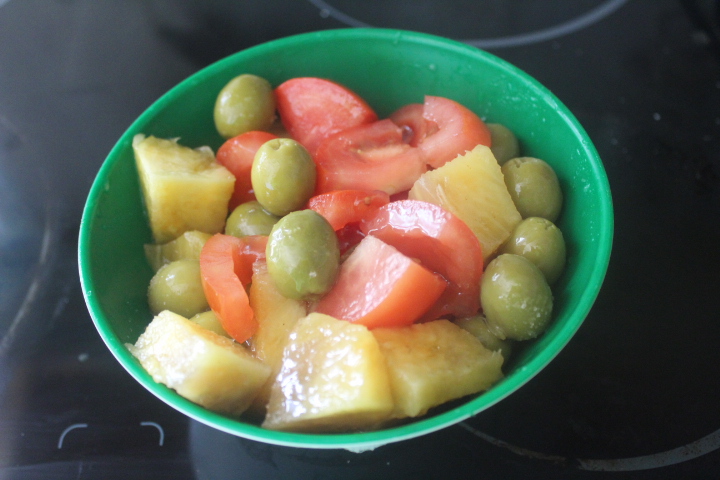 Colocamos en un recipiente la piña, las aceitunas y el tomate.