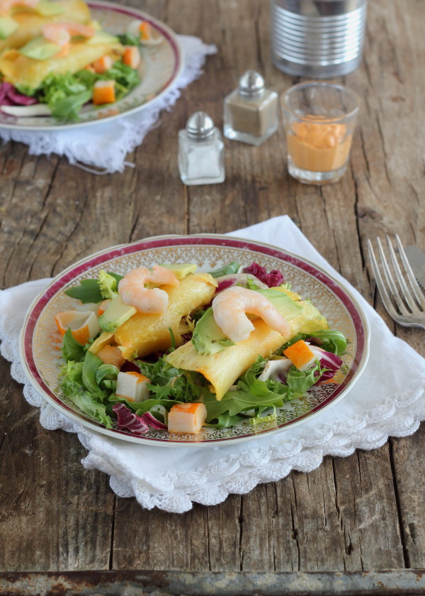 Cortamos la piña en lonchas con un cuchillo bien afilado o mandolina y rellenamos cada loncha con un poco de salsa rosa, el aguacate, gambas y palitos de cangrejo picados y hacemos un rollito.