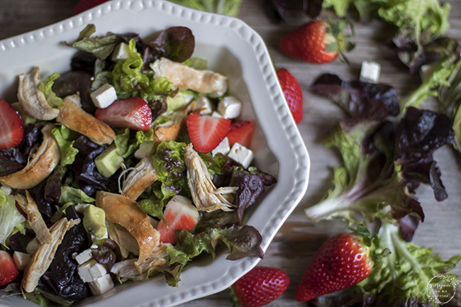 Lavamos bien la lechuga y troceamos, escurrimos el exceso de agua y disponemos en la ensaladera. Pelamos y cortamos en dados el aguacate y añadimos a la ensaladera. Lavamos las fresas y las cortamos en dos o cuatro trozos, añadimos el queso cortado en taquitos y, por último, le añadimos tiras de pollo asado.