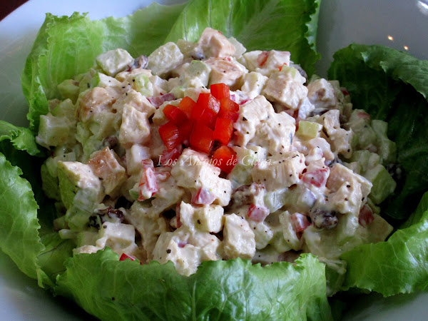 Cada vez me gustan más las ensaladas que incluyen frutas y verduras en su preparación, cuando las pruebo, me sorprende lo bien que combinan entre sí ingredientes tan disímiles. En el caso de esta ensalada de pollo el resultado es realmente apetitoso, con cada bocado disfrutaremos de una mezcla equilibrada de sabores en la se aprecia la dulzura de la uvas pasas y el pimiento, la acidez de la manzana verde, el toque fresco y aromático del apio, el suave gusto picante de la cebolla morada y el rico sabor sazonado de la pechuga de pollo. ¡Una verdadera delicia!