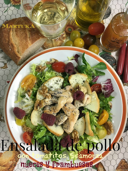 Se coloca el pollo por encima, las nueces, el queso cortado fino en triángulos y las frambuesas.