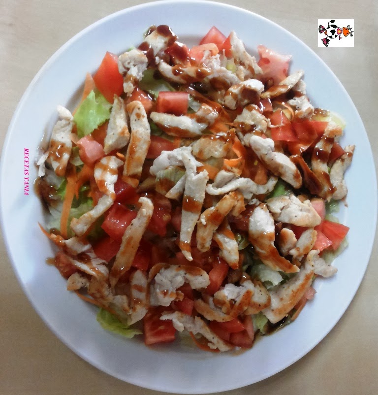 Lavamos y picamos la lechuga,lavamos y troceamos el tomate. Rallamos una zanahoria,mezclamos y reservamos. Picamos en tiras la pechuga de pollo,le ponemos un poquito de sal,pimienta molida y una cucharada de aceite de oliva,mezclamos todo bien y ponemos una sarten al fuego. Añadimos la pechuga de pollo y dejamos que se haga mientras removemos de vez en cuando. Una vez esté la pechuga la ponemos encima de la ensalada y aliñamos. Yo puse la mitad de vinagreta de chocolate y la otra mitad de vinagreta de frambuesa. Está riquisima y fresquita!! ;)