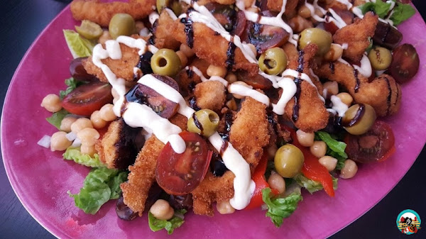 2.- Lavamos la lechuga o cogollos los ponemos escurrir en un colador y las troceamos con las manos. lavamos los tomates, los secamos con papel de cocina y los cortamos por la mitad. En una ensaladera o fuente disponemos las hojas de la lechuga, los dátiles, las tiras de pollo fritas, las aceitunas escurridas, los garbanzos cocidos, las tiras de pimientos escurridas y la cebolla. rociamos con un poco de aceite de oliva.Salpimentamos al gusto, le añadimos la mayonesa y el vinagre balsámico. Servimos enseguida.