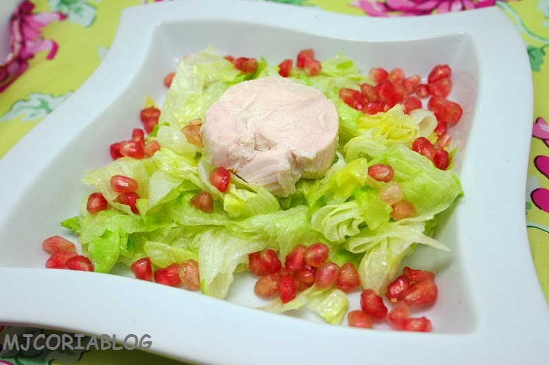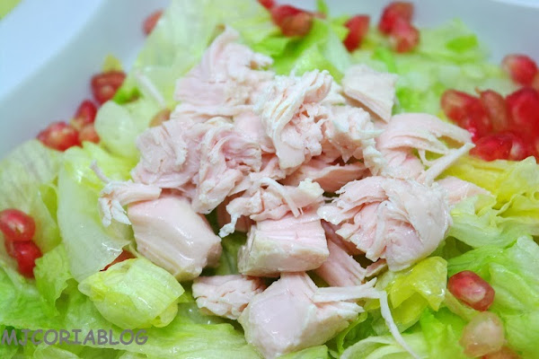 Aquí sin complicaciones, simplemente cortar nuestra lechuga previamente lavada, escurrir la lata de pechuga y colocarla en el plato y poner las pepitas de la granada.