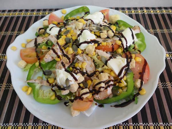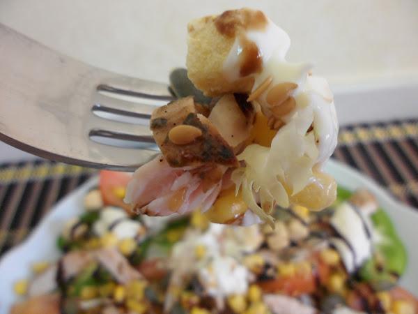 -Colocar de manera que nos agrade en el plato, y aliñar al gusto (yo con mahonesa y crema de balsámico de módena).