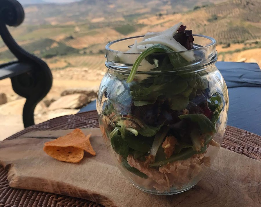 Pondremos en la base lechuga sin aplastar que tenga volumen,por encima el pollo después más lechuga y por último unas las lascas de queso y lista,movéis bien y a disfrutar.