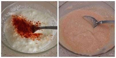 Primero hacemos las salsa mezclando todos los ingredientes, el yogurt, zumo de limón, sal al gusto y el pimentón. La reservamos.