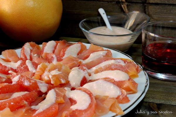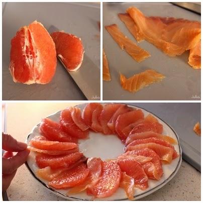 Partimos el salmón en tiras y las vamos intercalando entre los gajos de pomelo.