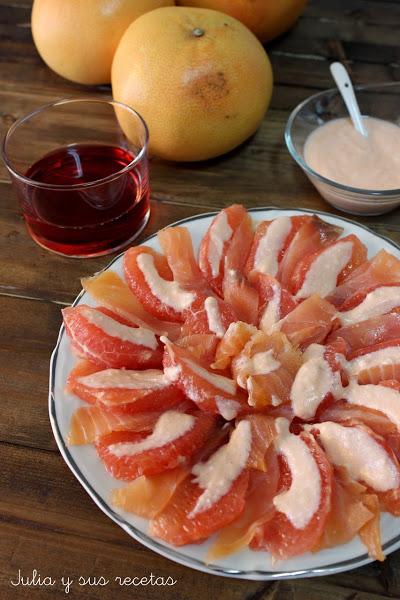 La ensalada de hoy está hecha con pomelos de Hort Alba Garcés, y salmón ahumado, una combinación muy rica además de sana. Con un buen contraste de sabores y texturas que hacen de ella un plato delicioso.