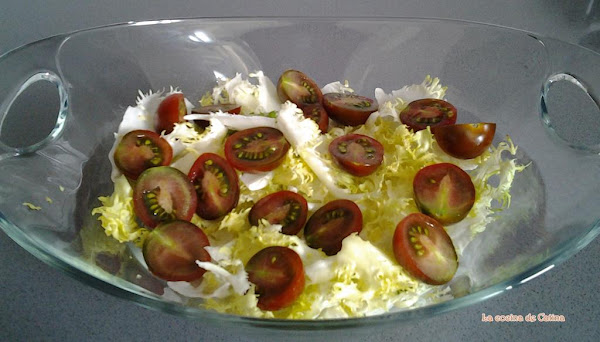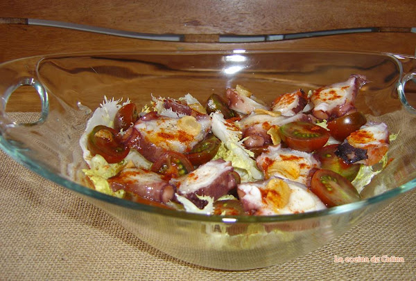 Cortar los tomates cherry por la mitad y añadirlos a la ensaladera. Incorporar los trozos de pulpo, los chips de ajo y espolvorear con una pizca de pimentón.