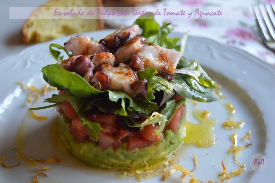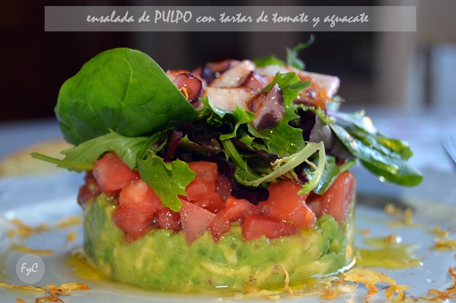 Ponemos el aguacate chafado dentro de un aro de emplatar y le ponemos unas vueltas de molinillo de pimienta. Encima el tartar de tomate, las lechugas y por último el pulpo. Regamos con un buen AOVE y ponemos pimentón sobre el pulpo, retiramos el aro y listo para consumir.