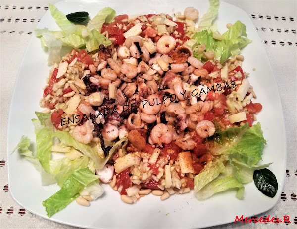 Poner en un recipiente el tomate, la cebolla, los piñones la lechuga, los langostinos y el pulpo.