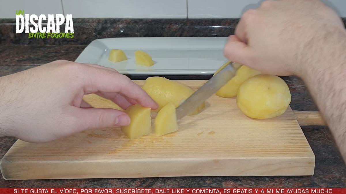 2Una vez cocidas las patatas, las enfríamos, las pelamos y las cortamos en trozos medianos más o menos del mismo tamaño.