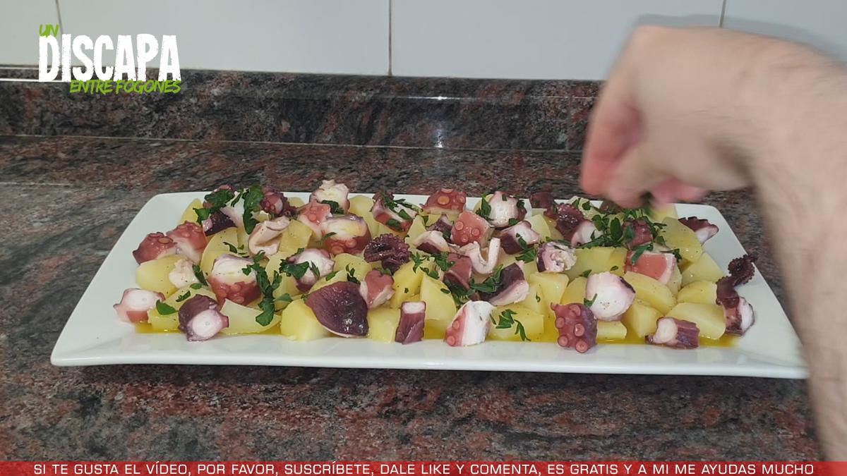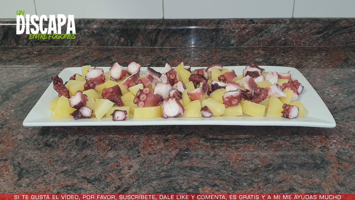 Vamos colocando los trozos de pulpo junto con la patata procurando que quede lo más repartido posible.