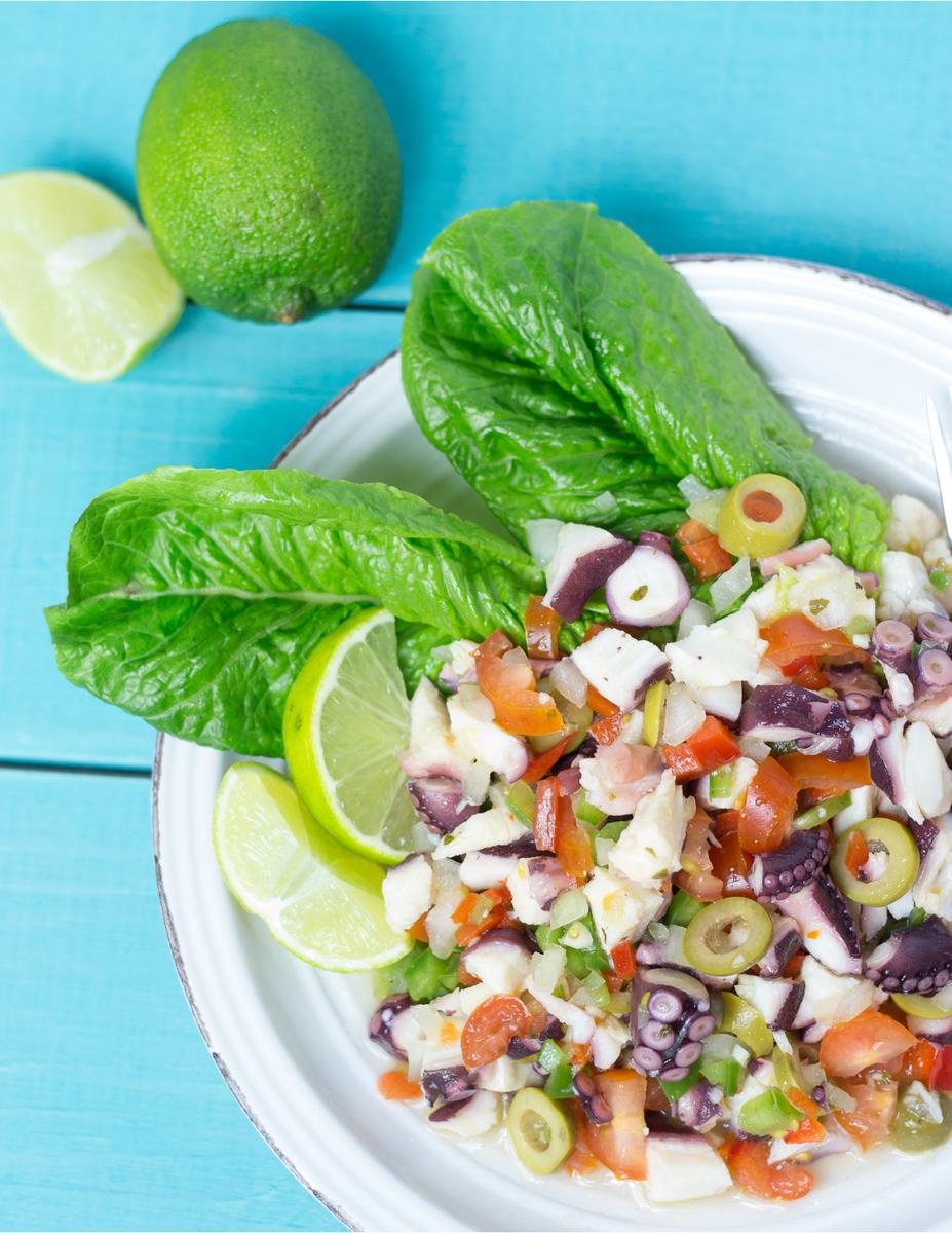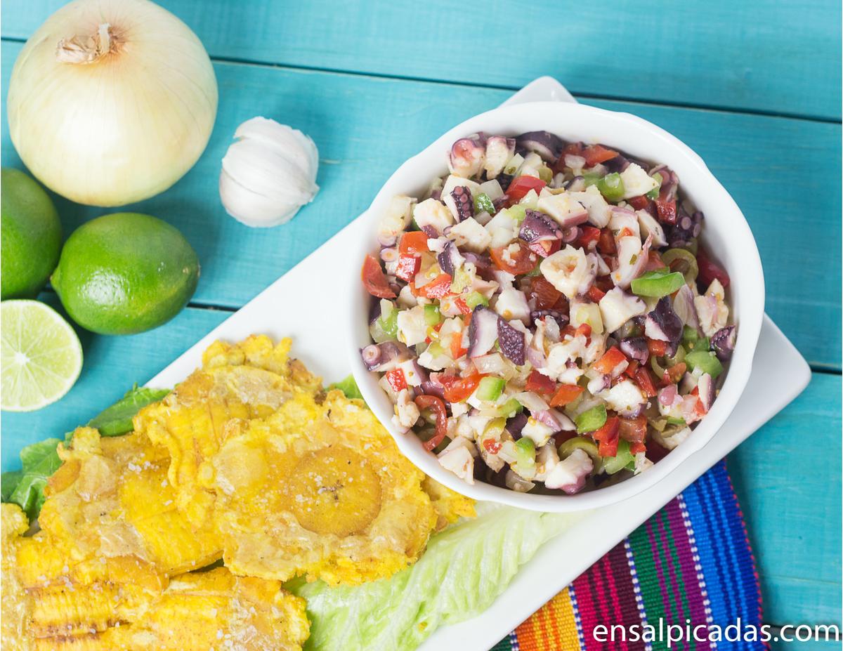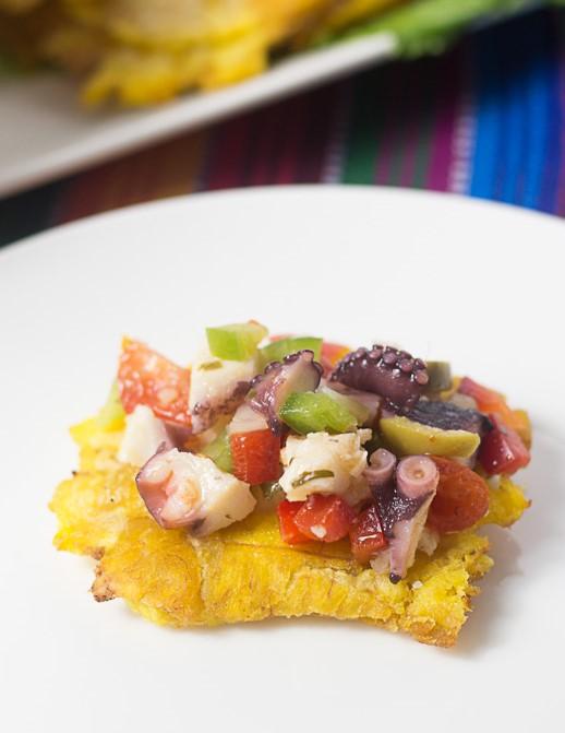 Recomiendo picar el pulpo en pedacitos bien pequeños para que puedas servirlo sobre tostones o galletas.