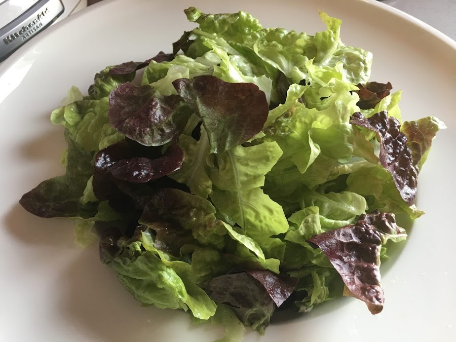 1. Lavamos bien, troceamos y emplatamos la lechuga de roble.
