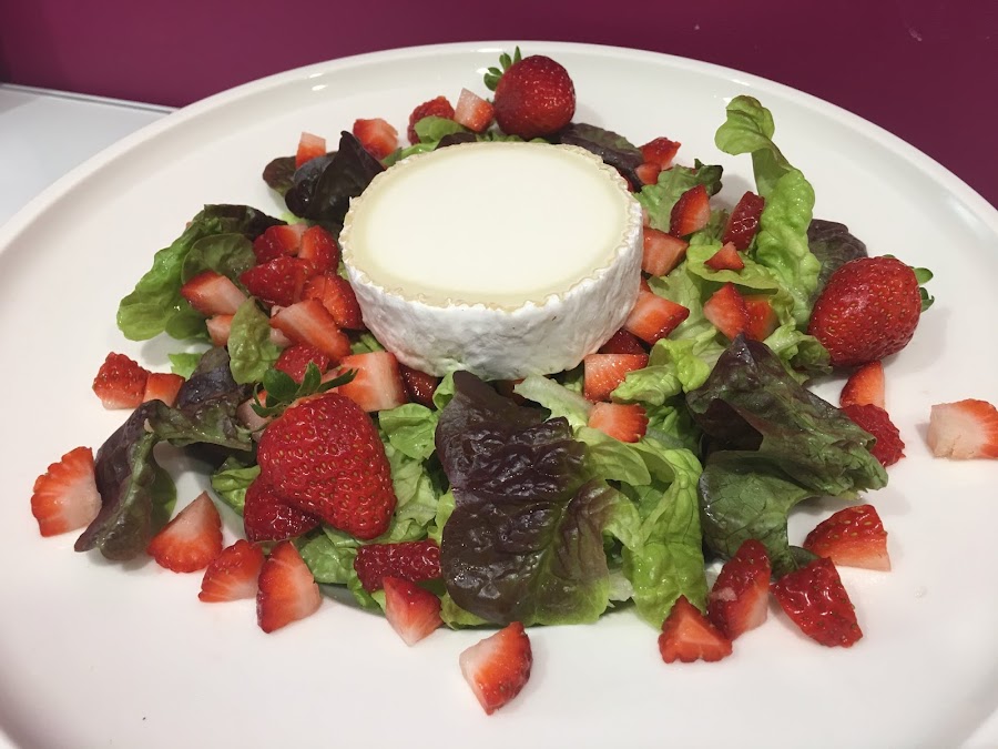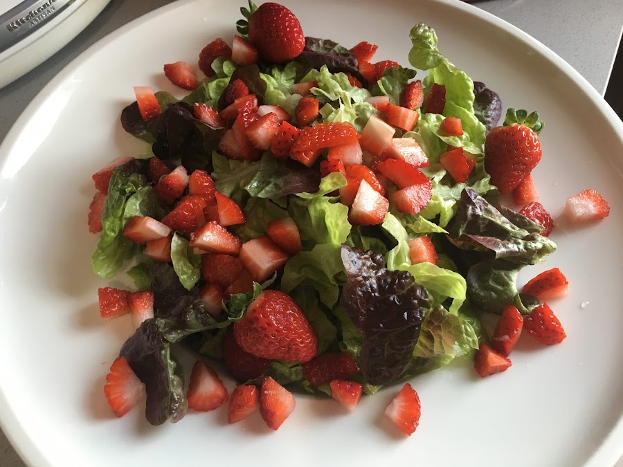 2. Lavamos, secamos y cortamos las fresas a cuadraditos pequeñitos. Repartimos por encima de la lechuga.