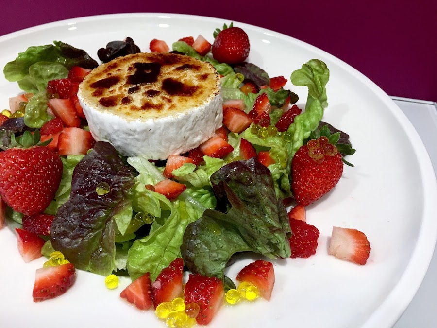 3. Colocamos la rodaja de queso de cabra sobre la ensalada. Ponemos sobre ella los 20g de azúcar, y con ayuda del soplete caramelizamos bien toda la superficie.