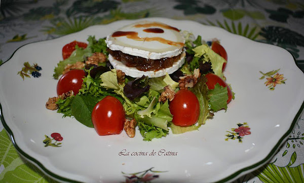 En la base del plato ponemos los brotes de lechuga, (lo mejor es utilizar brotes variados). A continuación ponemos una rodaja de queso de cabra (mejor comprarla del mostrador de charcutería para que las rodajas sean mas gordas que las de los rulos que se venden en los lineales). Sobre el queso añadimos la cebolla caramelizada y tapamos con la otra rodaja de queso.