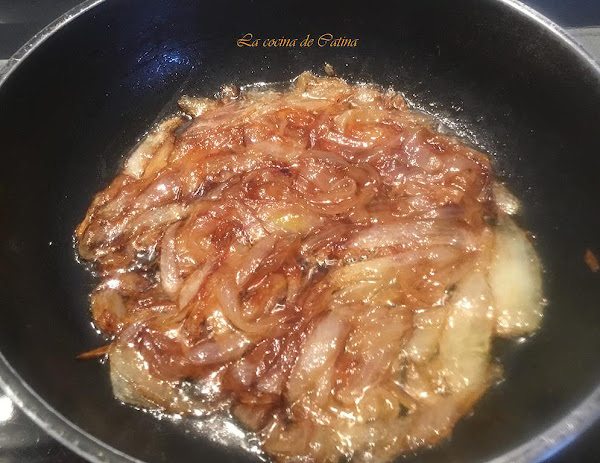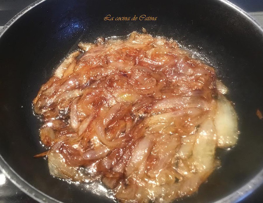 Primero vamos a preparar la cebolla caramelizada (se puede comprar ya elaborada), para ello cortamos la cebolla en juliana, mas o menos toda del mismo tamaño para que se nos cocine de forma uniforme.