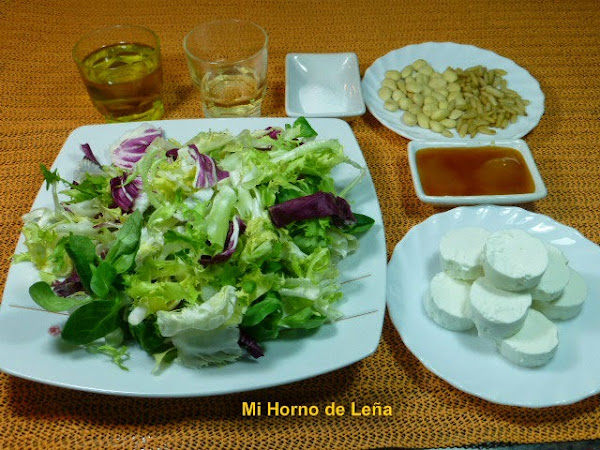 Ya tenemos la ensalada lista. El contraste de la ensalada fría con el queso y el aliño caliente es todo un acierto, sin olvidarnos de la miel, que le da un gusto muy rico.