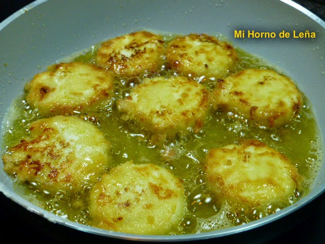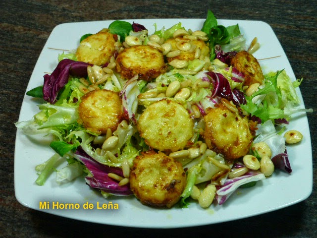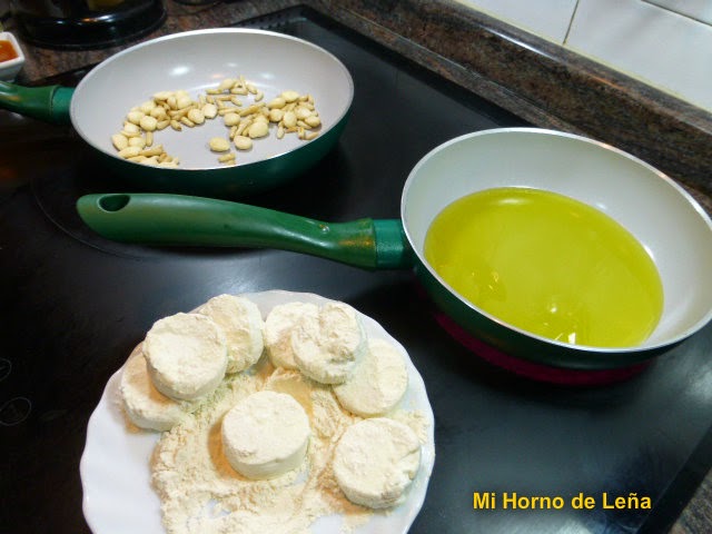 Ponemos aceite de oliva en la sartén y freímos las ruedas de queso de cabra previamente pasados por harina. Cuando estén dorados por un lado les damos la vuelta.