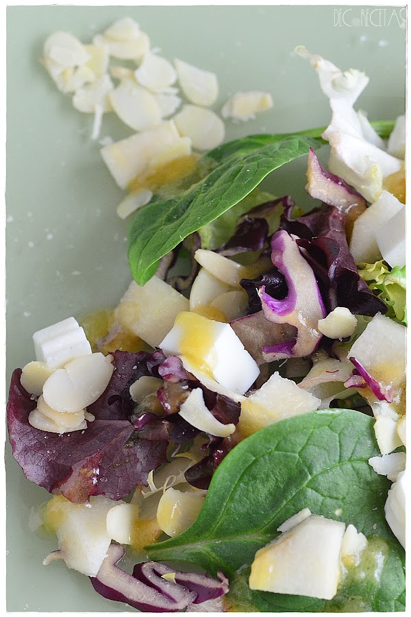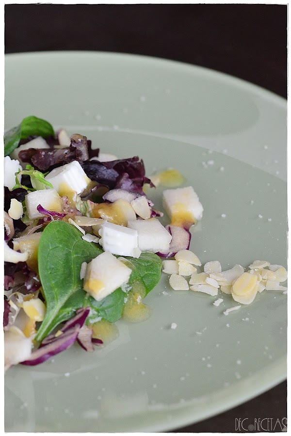 Para la ensalada mezcla lo que tenía por casa que en este caso era queso fresco, pera y hojas de lechuga variadas junto con unas láminas de almendra que le dan ese toque diferente