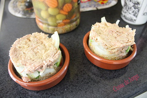 Terminamos colocando el atún sobre la cebolla y el aguacate.