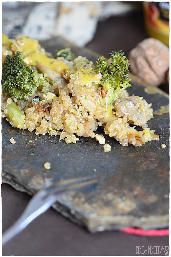 En un wok, añadí una cucharada de aceite donde rehogué la cebolla hasta que estaba dorada, y posteriormente los champiñones. Una vez listos, añadí el brécol y coliflor cocinados al vapor, la quinoa cocida, el tomillo y las nueces.