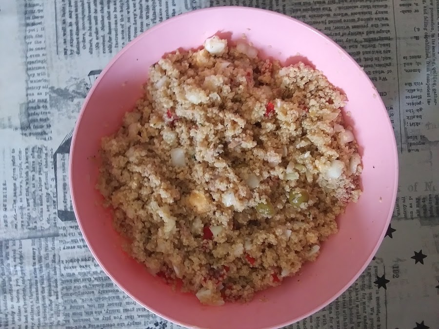 Añadimos el atún con su aceite y removemos. Agregamos el huevo, el pimiento, las aceitunas y el sazonador de ensalada. Removemos y dejamos en la nevera hasta el día siguiente.
