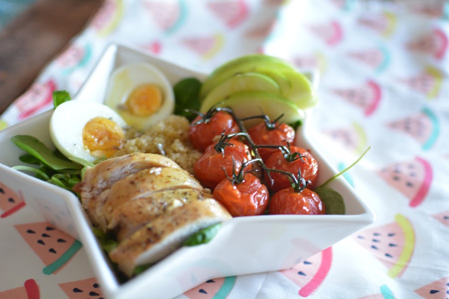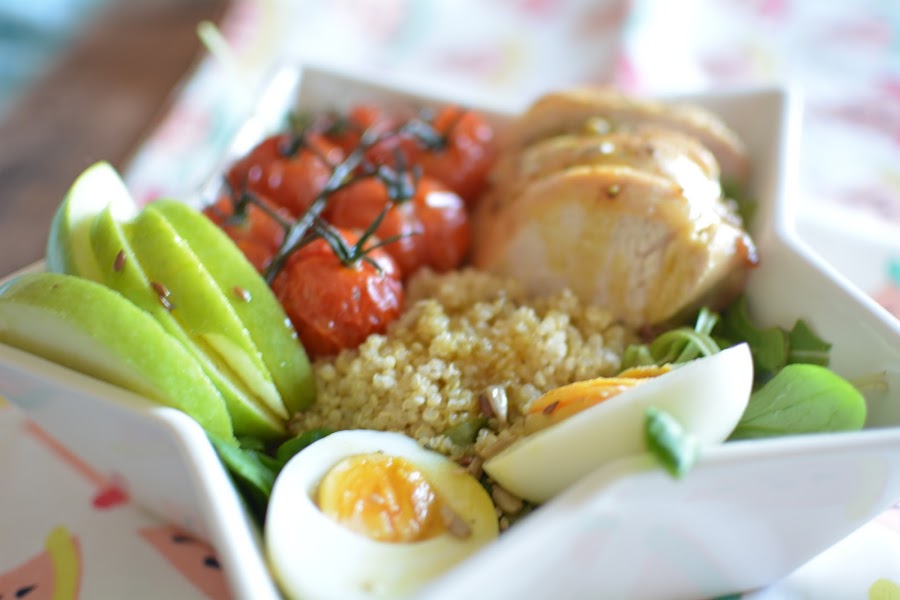 Lavamos los canónigos y las rúcula, los mezclamos y servimos en un bol. Encima colocamos las rodajas de pollo asado, el huevo duro partido por la mitad, los tomatitos cherry asados y las rodajas de manzana verde. Rociamos con un buen chorro de vinagreta de miel y mostaza.