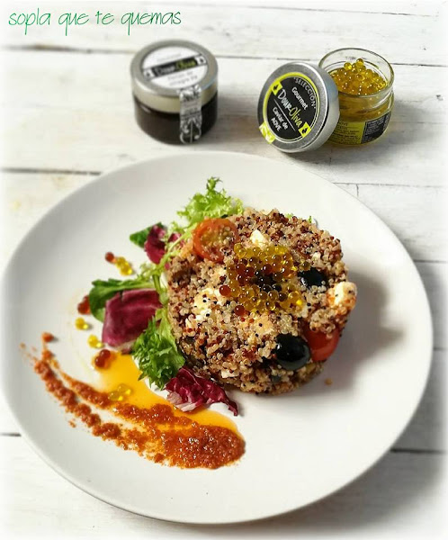 Como la quinoa por si sola no tiene mucho sabor la he acompañado de una deliciosa vinagreta de tomates secos, y por encima he usado las perlas de aceite de oliva y las perlas de PX de Douroliva. Ha quedado un plato espectacular la verdad, la mezcla de ingredientes nos ha gustado mucho.