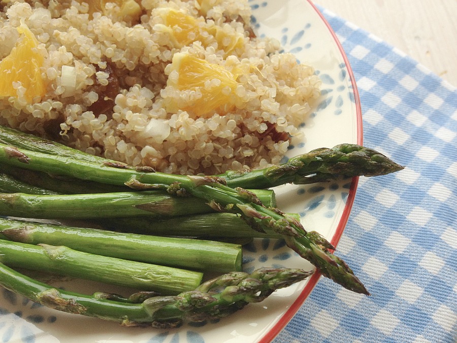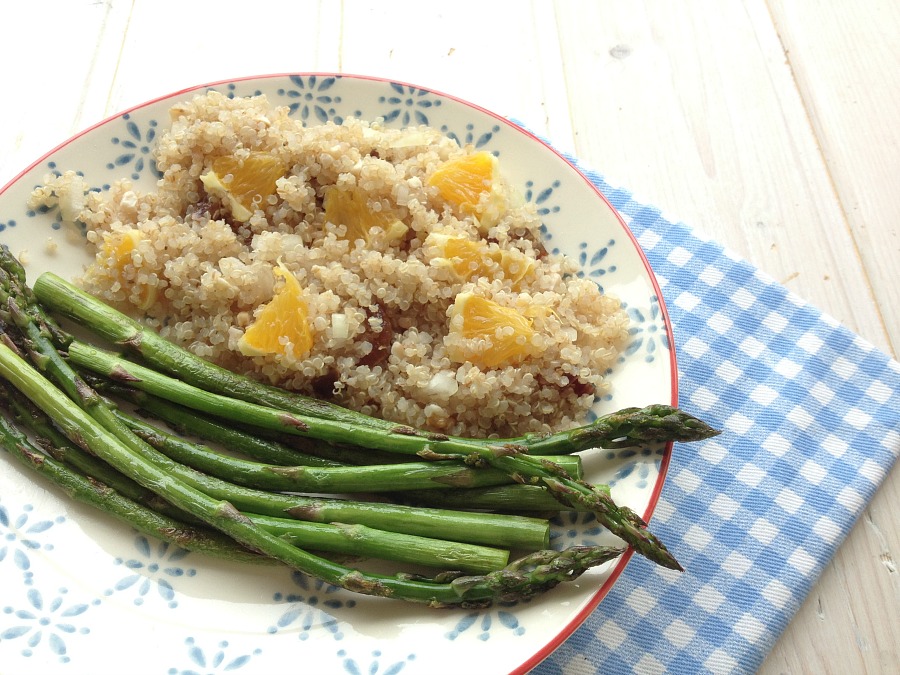 Ensalada de quinoa, dátiles y naranja con espárragos
