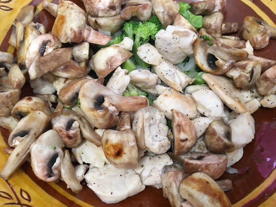 Una vez hechos los champiñones los añadimos al brocoli, a la cebolla y al pollo.