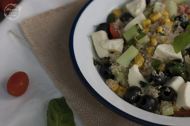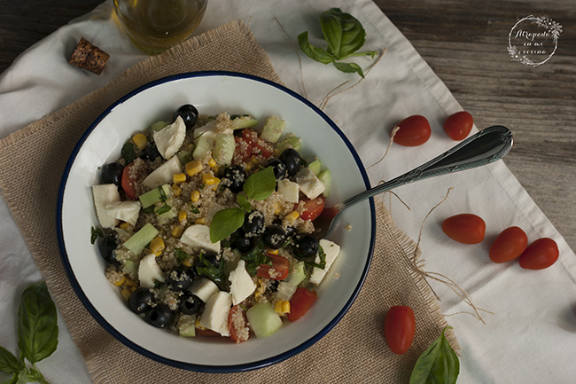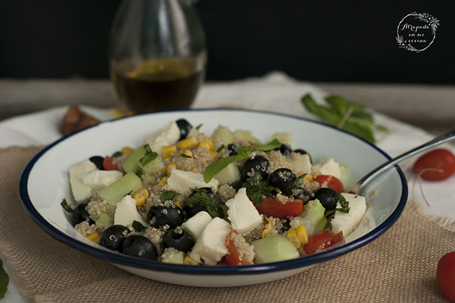 Ponemos a cocer la quinoa en agua fría durante diez minutos, escurrimos y dejamos reposar cinco minutos más. Picamos el pepino, los tomates y el queso. Reservamos. Sacamos también las aceitunas negras y el maíz de la lata, escurrimos el líquido y reservamos.