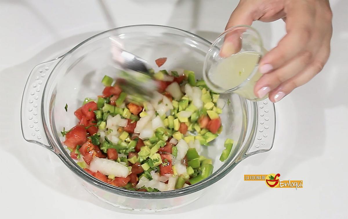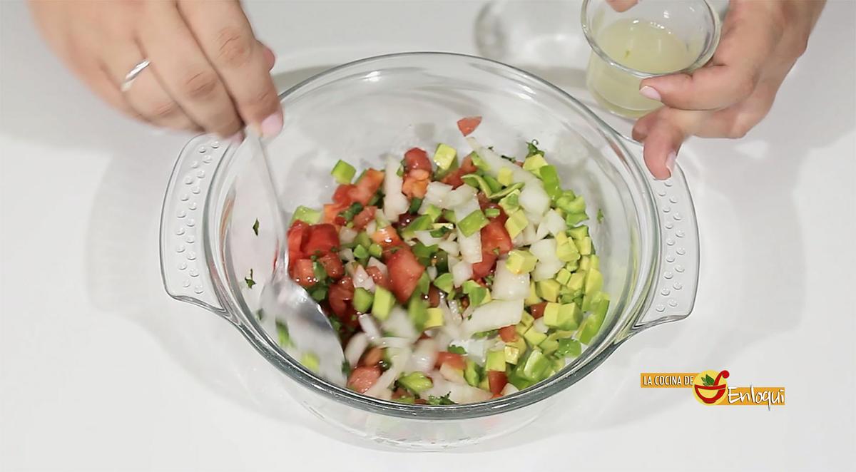 Pon todos estos ingredientes en un bol, añade el zumo de lima. Mezcla y reserva.